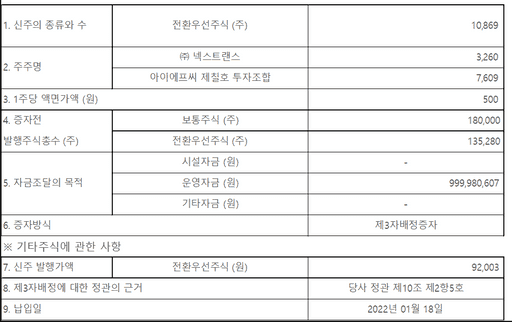 본 회사는 상법 제418조에 따라 금번 2021년 12월 20일 임시주주총회에서 아래와 같이 제3자배정방식에 의한 신주발행을 결의하였으며 이에 따라 본 회사의 주주분들께 신주발행을 공고합니다.